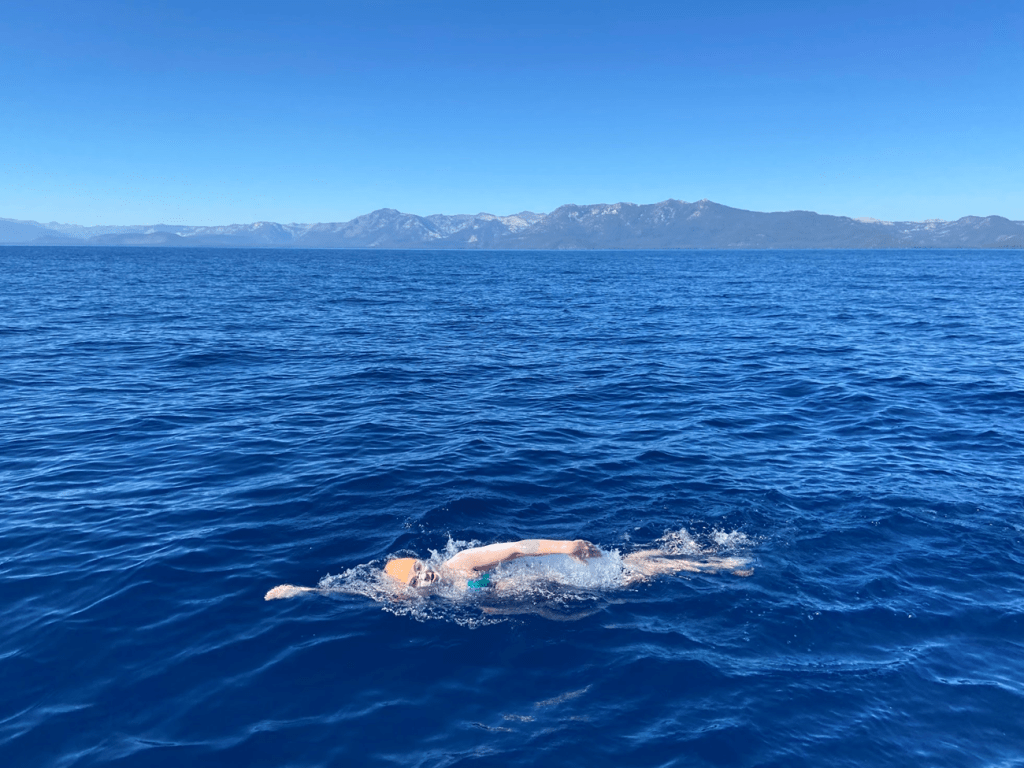 Before I could even really grasp that it was time to begin the swim, I was jumping into the water feet first and swimming towards the beach. During training, I had worried about the beginning of this swim and whether I would feel anxious swimming in the dark. I had done a few very early morning training swims, but I still wasn’t fully confident that I would be comfortable swimming in the dark in Lake Tahoe. This was some of the darkest water I had ever swam in, yet I somehow felt comforted by the lack of visual input. When I got up onto dry land (rocks, in this case), I thought to myself, “I’m just going for a little swim.” This phrase had brought me comfort many times during training. My greatest hope for the swim was that it would feel anticlimactic and that I could enjoy the experience without putting unnecessary pressure on myself to finish in a certain time. I wanted to avoid thinking, “I’ve got to make it to the other side,” and instead wanted to focus on swimming in the moment. I endeavored to enjoy the swim because of the swimming and to trust that I could safely allow my mind the space to let go of the stress, anxiety, and fear I had been holding onto.
