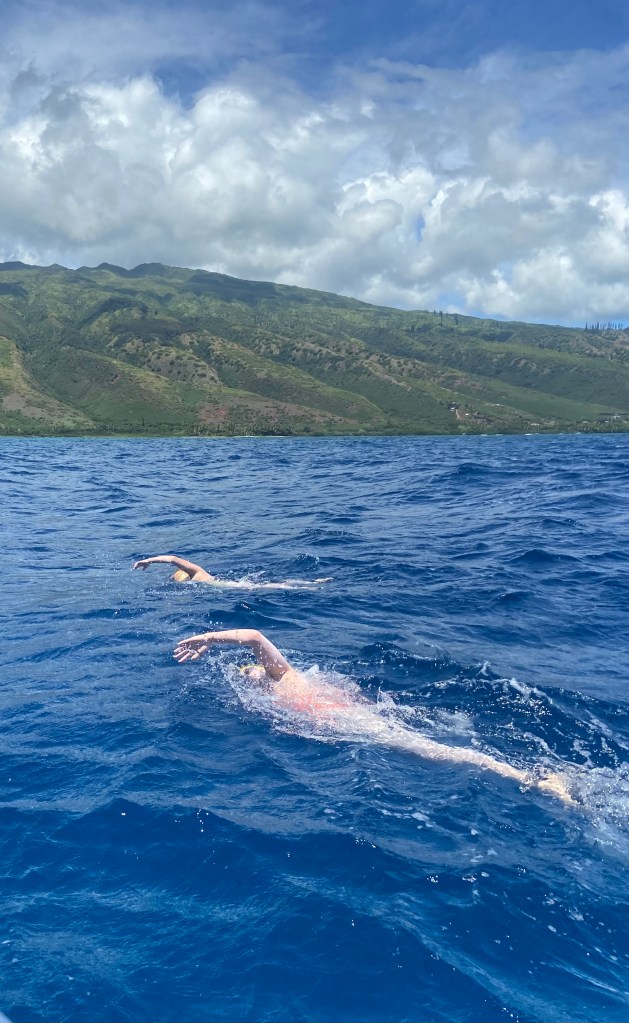 I am usually a ball of anxiety before a long swim, but this morning felt different, even with all the chatter around jellyfish and sharks. As I ran off the back of the boat and dove into the ~80° water, I was filled with joy and excitement for the adventure ahead. With Abby by my side, I was able to calmly think of this major undertaking as “just another long swim with my good friend.” Abby cautiously entered the water and together we swam towards the Maui shoreline.