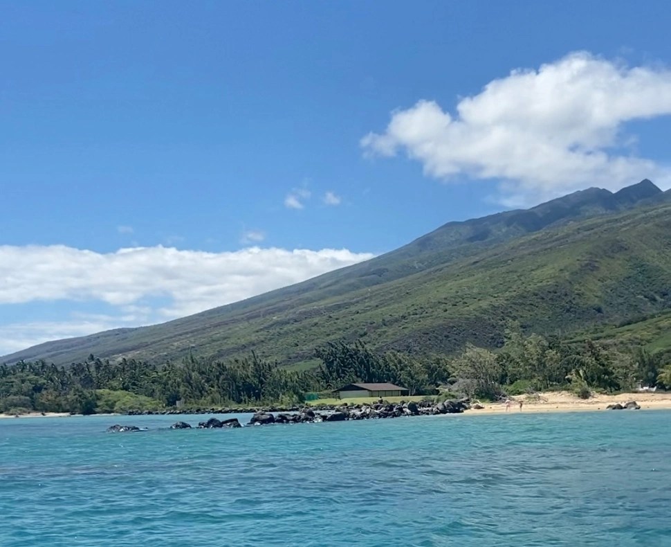 We fed again and then I noticed that I could see the ocean floor. When I did the Vikingsholm swim in Lake Tahoe in July 2022, I made the mistake of getting excited when I started to see the bottom of the lake. Unfortunately, I was just seeing the sand at the entry to Emerald Bay, and I still had about 1.5 miles to swim. Naturally, the entire rest of that swim was mentally excruciating, so I gave no meaning to seeing the sand off Moloka’i. I didn’t want to make that mistake again! I reminded myself that I could see the ocean floor for about an hour while swimming away from Maui. Instead of wondering how much longer we would be swimming, I simply appreciated the change in scenery and took pleasure in looking around for fish and turtles. As we got closer to Moloka’i, Captain Keith told us to sight on a house at the shoreline. He would need to maneuver around a reef and then would meet back up with us. The color of the water changed from deep blue to light blue to bright teal as we got closer to the island.