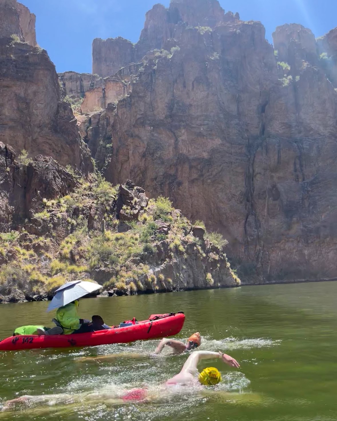 I would occasionally sight out of curiosity for where other swimmers were, but tried not to focus too much on the external environment. I found it very important to create a calm inner space during this swim to set the tone for the subsequent days in the water. At about 3 hours, I noticed that it seemed like we were aiming to a small outcropping of land on the south canyon wall. I remembered my friend Leeann telling me that she swam extra distance during Saguaro because her kayaker didn’t take her directly to the dam. I hoped that Deedee knew where we were going!