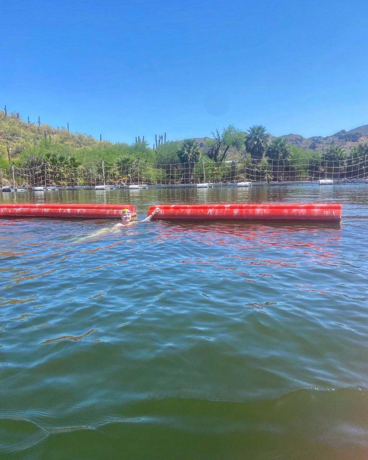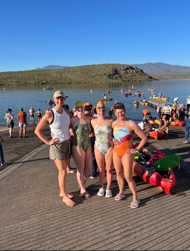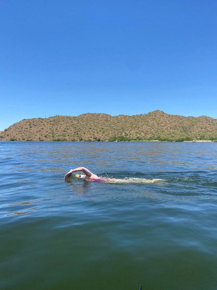 While it seemed that everything in the universe was guiding me to defer to 2024, something in my gut kept me optimistic that I could make it to Arizona. 48 hours before my flight, I talked with my friend, Erika, who was also dealing with some health issues and unsure if she would be able to swim. She encouraged me not to make any decisions until the next day. By then, I was feeling worse, and she encouraged me to just get on the plane and decide what to do once I was in Arizona. I felt overwhelmed and underprepared, but narrowing my focus to the immediate moment allowed me to get on the plane. I had only been in the water one time the whole month of April, and though I didn’t believe I had the physical stamina to swim the whole event, I had made peace with showing up and taking things lake by lake.