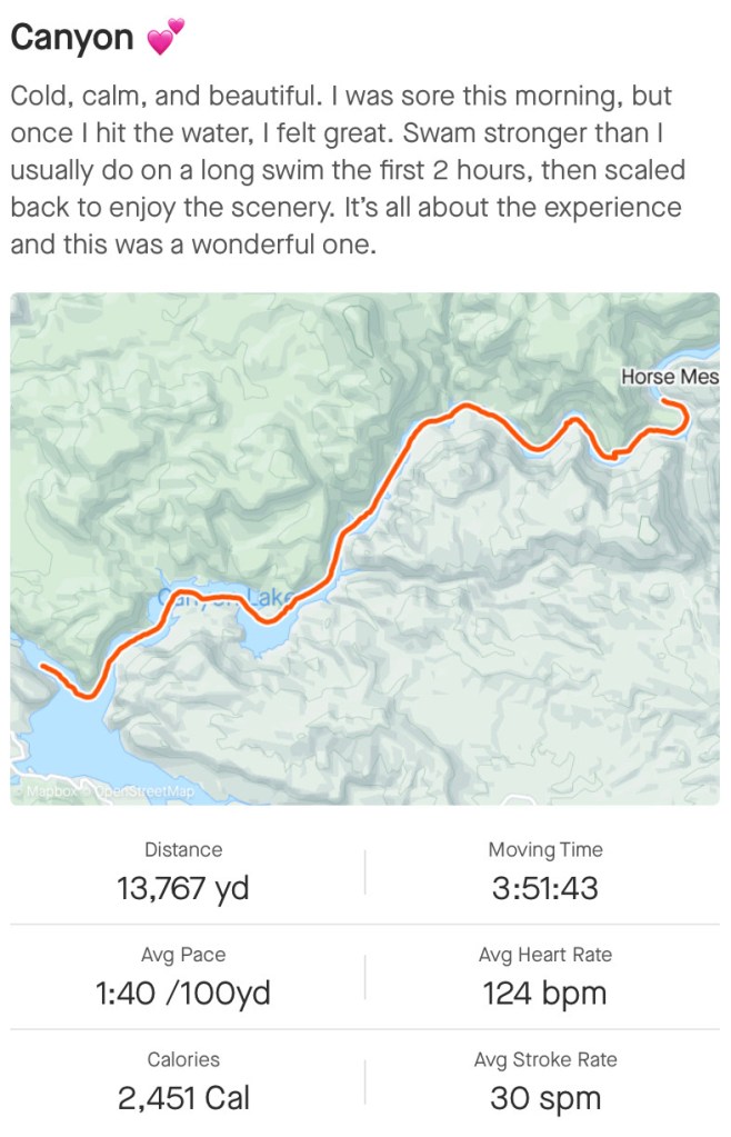 Plunging into the 55F water at the swim start felt like home. I am used to swimming in this temperature of water, and I was feeling grateful to be back in my element after what felt like such a long time away. I began swimming away from the dam and was quickly entangled in a group that was pushing towards a cove on the north canyon wall. I allowed them to pass in front of me and then began aiming more toward the middle of the canyon. I was feeling hungry but otherwise strong in the water.