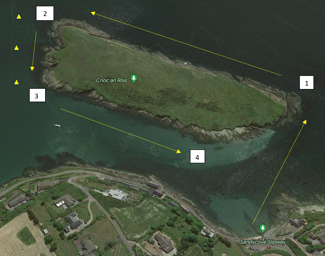 When I got out of my car at Sandycove, Ned approached me with a quite serious look on his face and asked if I was planning to do a lap of the island. The water was much wilder than I had yet seen, and I had considered just staying inside of the cove. There were large overhead waves crashing at corner 1 and whitecaps inside of the cove. I asked him for his input, and he told me that I was fast enough to swim around if I so desired, but I would have to follow a specific set of instructions for how to get around safely.
