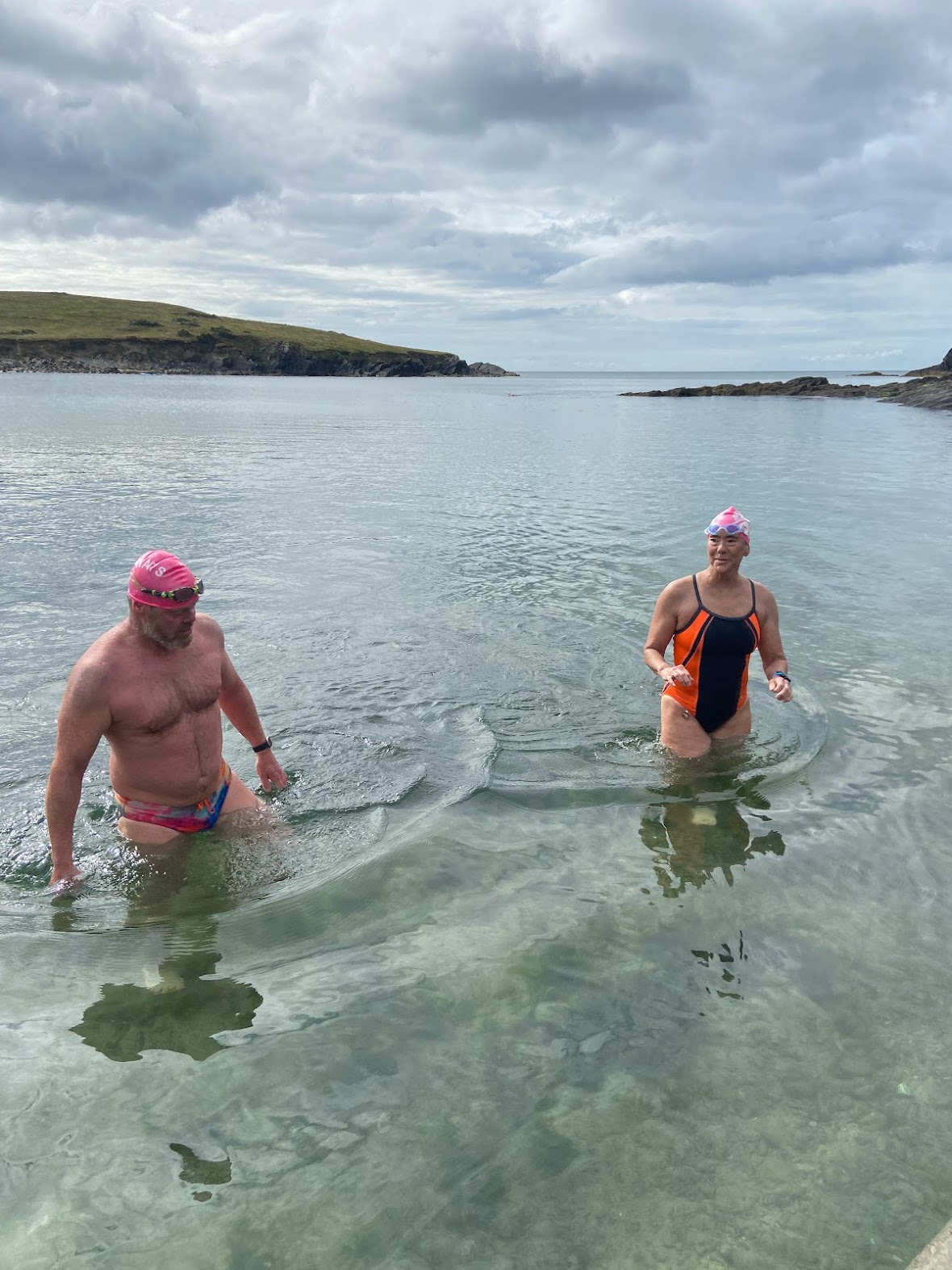 Before our first swim, Ned gave us a safety talk and explained the counterclockwise route we would be traversing around Sandycove Island. He explained the four corners of the island and how to safely navigate the particularities of each portion of the loop. We would enter the water from the slipway and were instructed to check in and out with volunteers to ensure that everyone was accounted for. Though I typically take my time when getting in, everyone at CDW plunged quickly into the 54F water, and I followed their lead. The water felt cool but not unfamiliar – I had been training in water as low as 46F all winter in San Francisco.