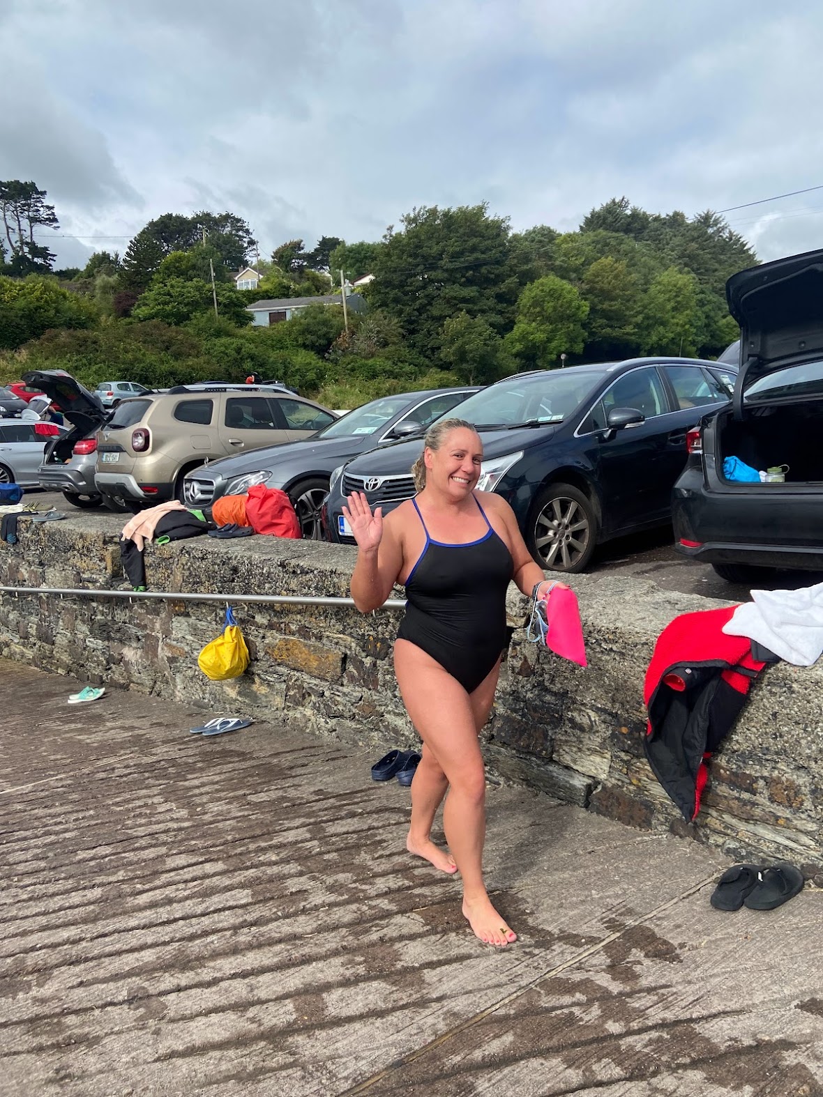 I felt even more low energy this morning. My pod was pulling progressively further away and something just felt off. I took a gel at the end of the second lap while they continued on around corner one. I decided it was best to stay inside of the cove and see if the gel would help boost my energy. I let a kayaker know I wasn’t feeling great and was planning to swim inside the cove and then swam towards the yellow buoy near corner three. When I reached the buoy, I wasn’t feeling any differently, so I reluctantly decided to swim back to the slipway and dry off. I was a little discouraged but also proud of myself for listening to my body and not pushing myself too hard. As I rewarmed on the seawall, I snapped some photos of my friends exiting the water.