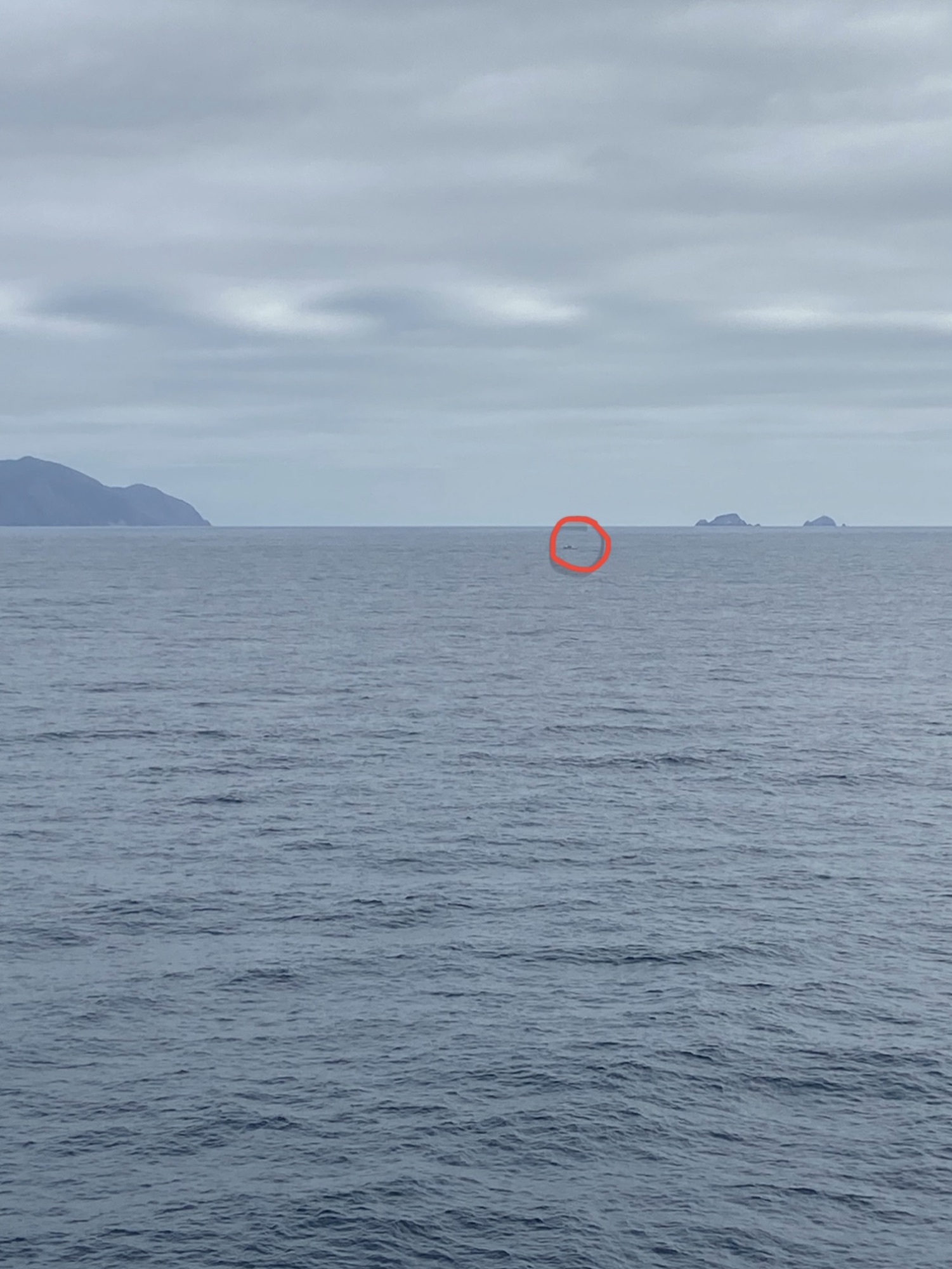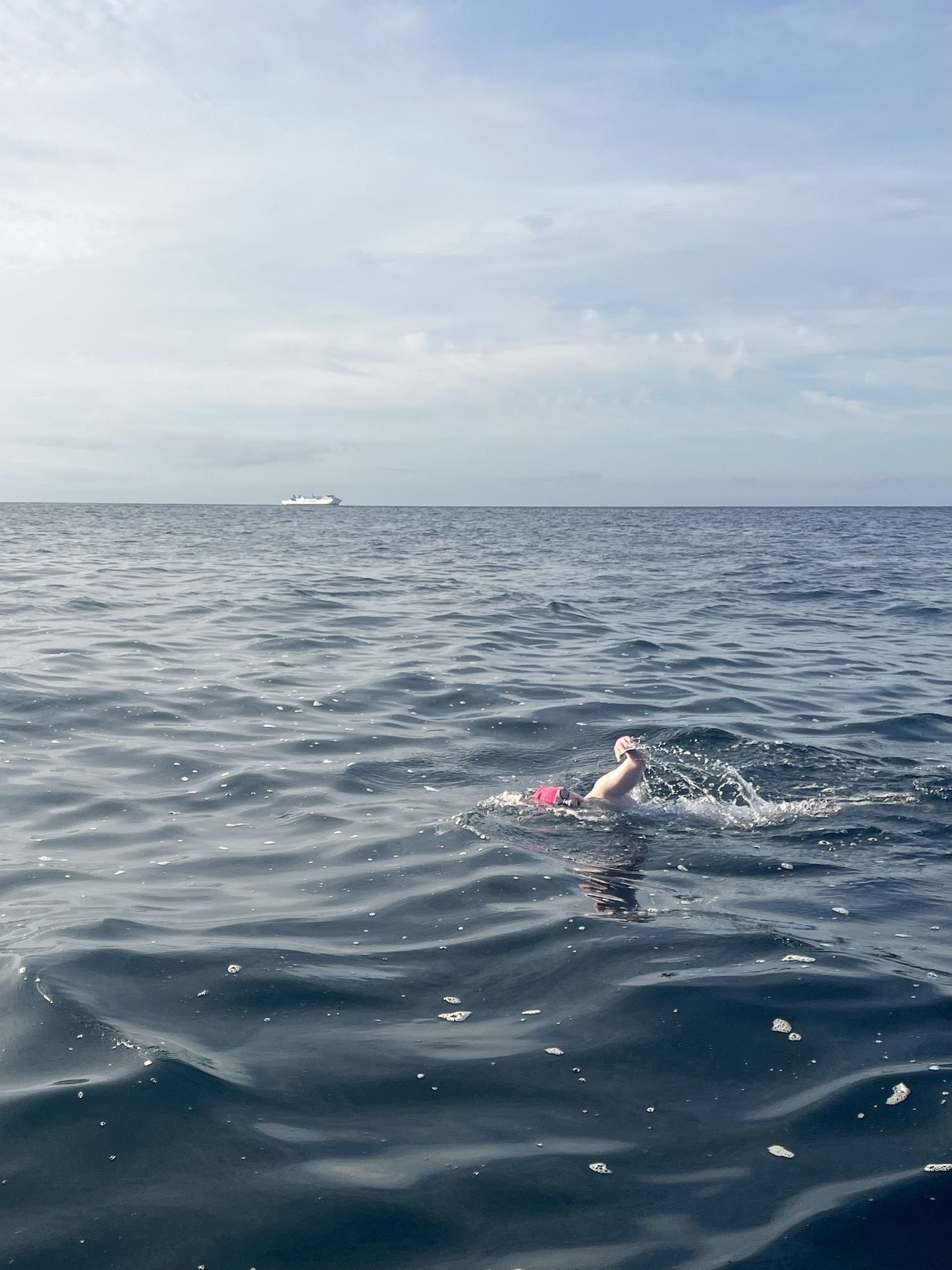 Even with taking a few jellyfish directly to the face, my mental state was very good. I passed the time by singing songs from Wicked, Six, and Hamilton and enjoying watching the massive albatross flying around me. One bird in particular seemed to learn my feed schedule, and would swim along behind me as if hoping for a treat. At one point, I noticed my crew fidgeting with the Shark Shield and looking off into the distance. I was beginning to worry if they had seen a shark, so I stopped to quickly ask and hopefully put my anxiety at ease. Thankfully, they were simply admiring a pod of common dolphins while changing the device’s battery. This was an affirming practice in not allowing my mind to spiral out over uninformed inferences made from the water! The pod of dolphins soon came to visit and swam around me for a few minutes.