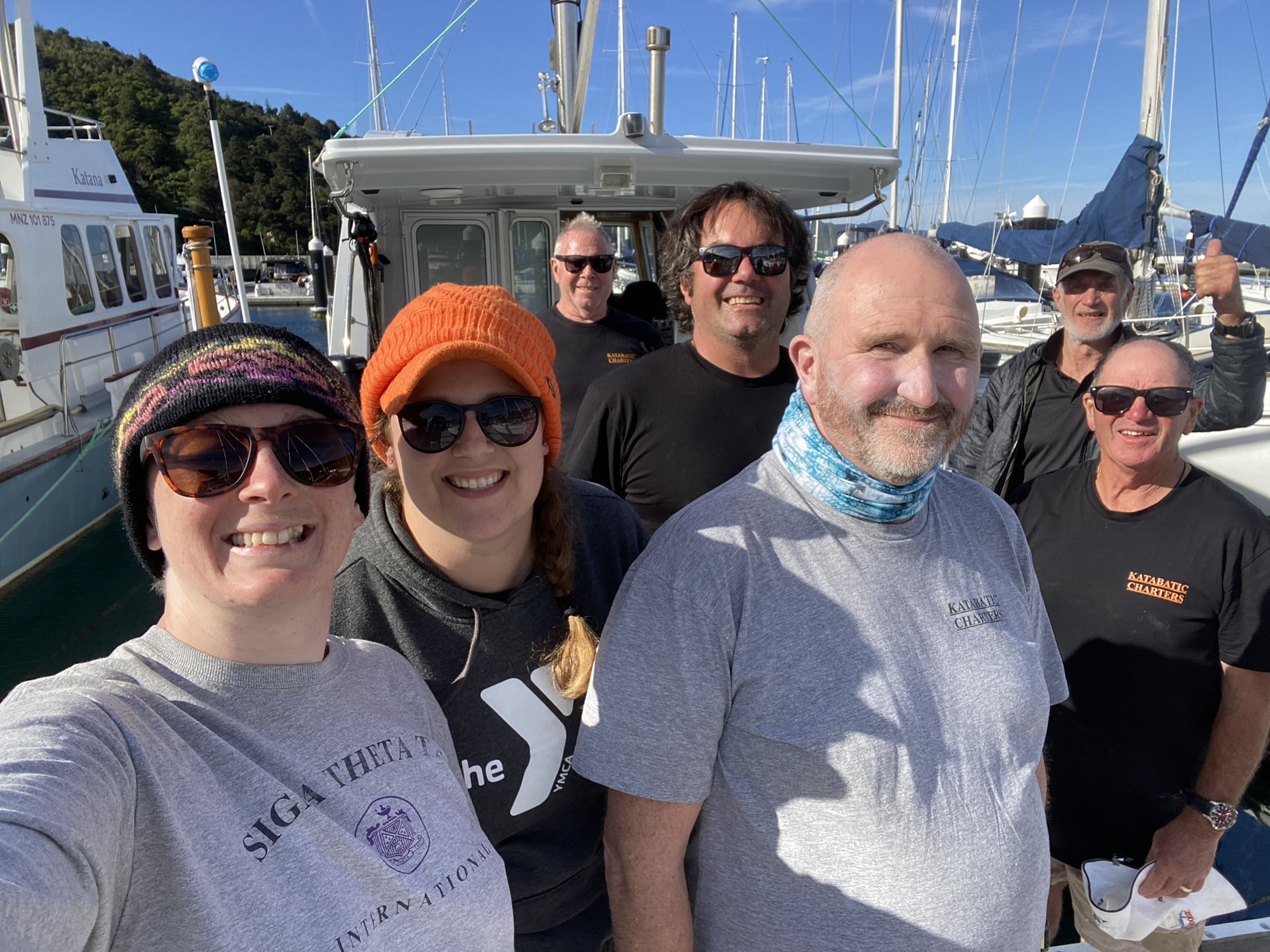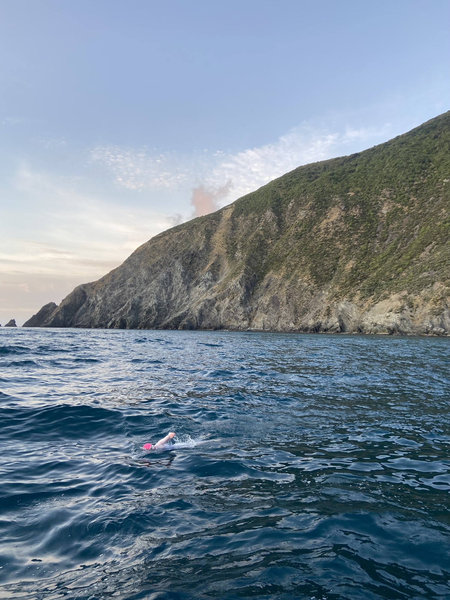 I got a great night of sleep and woke up at 0345 full of excitement for the adventure ahead. After the safety briefing and tour of the boat, Katabatic, we embarked on a 1.5 hour ride to the swim start location on Arapaoa Island. Grant pointed out interesting landmarks along the way, including salmon and green lip mussel farms and the defunct Perano Whaling Station.
