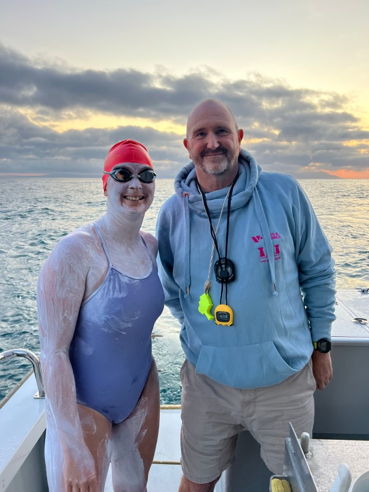 I swam up to Don in the IRB and he asked, “I suppose you’d like a ride back?” I replied in affirmation and we laughed together about how ungracefully I plopped into his boat. Once I was back on Katabatic, the crew showered me with love and Deedee helped me remove the still thick layers of zinc. The Sudocrem I was so worried about had worked brilliantly and I had no sunburn! I laid down in the cabin for the 2.5 hour ride back to Picton, beaming with pride at what I had just accomplished. I swam with steady effort and a stroke rate of 62-63, a bit higher than my normal 58-60. My pacing was consistent excluding the time I spent in the rip current. The water was 59F at the start and around 64F at the warmest point, and I wasn’t cold during or after the swim. Overall, this swim was an incredible experience that amplified my love for marathon swimming. I am very thankful to Conny for giving me the slot, Deedee for being my always incredible support system, Grant and crew of Katabatic Charters for keeping me safe, and my community for supporting me as I pursue my goals.
